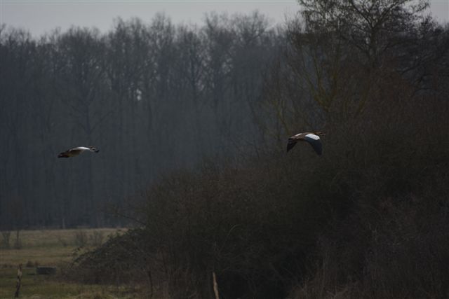 Ouettes d'Égypte (Alopochen aegyptiaca). Plusieurs couples occupent les étangs du "Eller" (près de Sarralbe) depuis quelques années déjà... Photo : Pauline Ringeisen