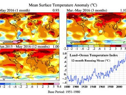 En mai 2016, l’indicateur de température planétaire dépasse de 0,93°C la moyenne 1951/1980. C’est ce qui ressort de l’analyse publiée par l’équipe Nasa/Université Columbia de New York. La température calculée sur la période de janvier à mai 2016 dépasse cette moyenne de 1,15°C, un niveau très élevé, montrant que l’objectif fixé à la COP-21 de viser une hausse maximale de 1,5°C relativement à la période pré-industrielle (1750) est hors de portée.