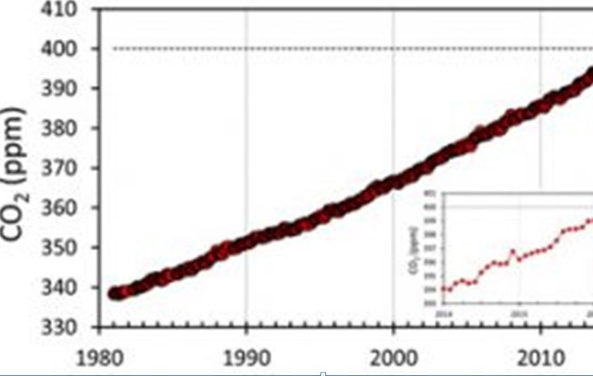 Sur 35 ans, l’augmentation est de 18% ( de 339 à 400 ppm). Toutefois, le taux de croissance a varié. Il n’était que de 1,30 ppm par an dans les années 1980, il dépasse les 2 ppm par an depuis 2012.
